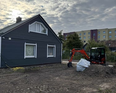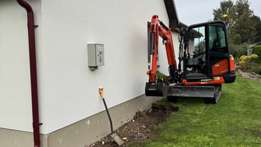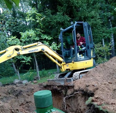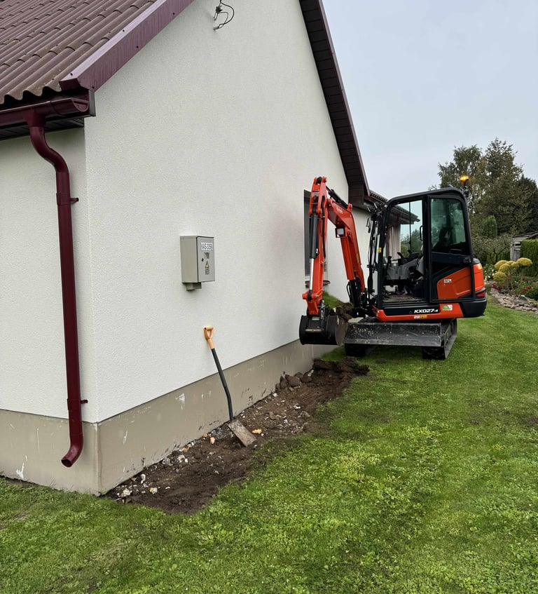 Esame profesionalai, teikiantys tranšėjų, pamatų, drenažų ir kitų požeminių sistemų kasimo bei įrengimo paslaugas mini ekskavatoriumi.