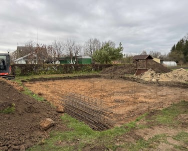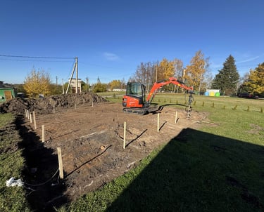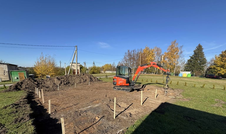 Sklypo paruošimas statybai: augalinio sluoksnio nuėmimas pamatams, aikštelėms, keliams ir sklypo lyginimas.