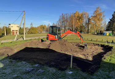 * Mini ekskavatoriaus nuoma su operatoriumi ir visi žemės kasimo darbai *Planiravimo darbai *Vietiniai nuotekų valymo tinklai *Nuotekų valymo įrenginiai *Drenažo sistemų įrengimas *Drenažo šulinių įrengimas *Žemės kasimo, lyginimo darbai *Tranšėjų, pamatų, drenažų, kanalizacijų, vandentiekių, elektros kabelių, dujotiekiui, nuotekoms ir kitoms požeminėms sistemoms kasimas, užkasimas, įrengimas *Polių gręžimas *Kelmų rovimas *Pamatų atkasimas šiltinimui *Grunto nukasimas